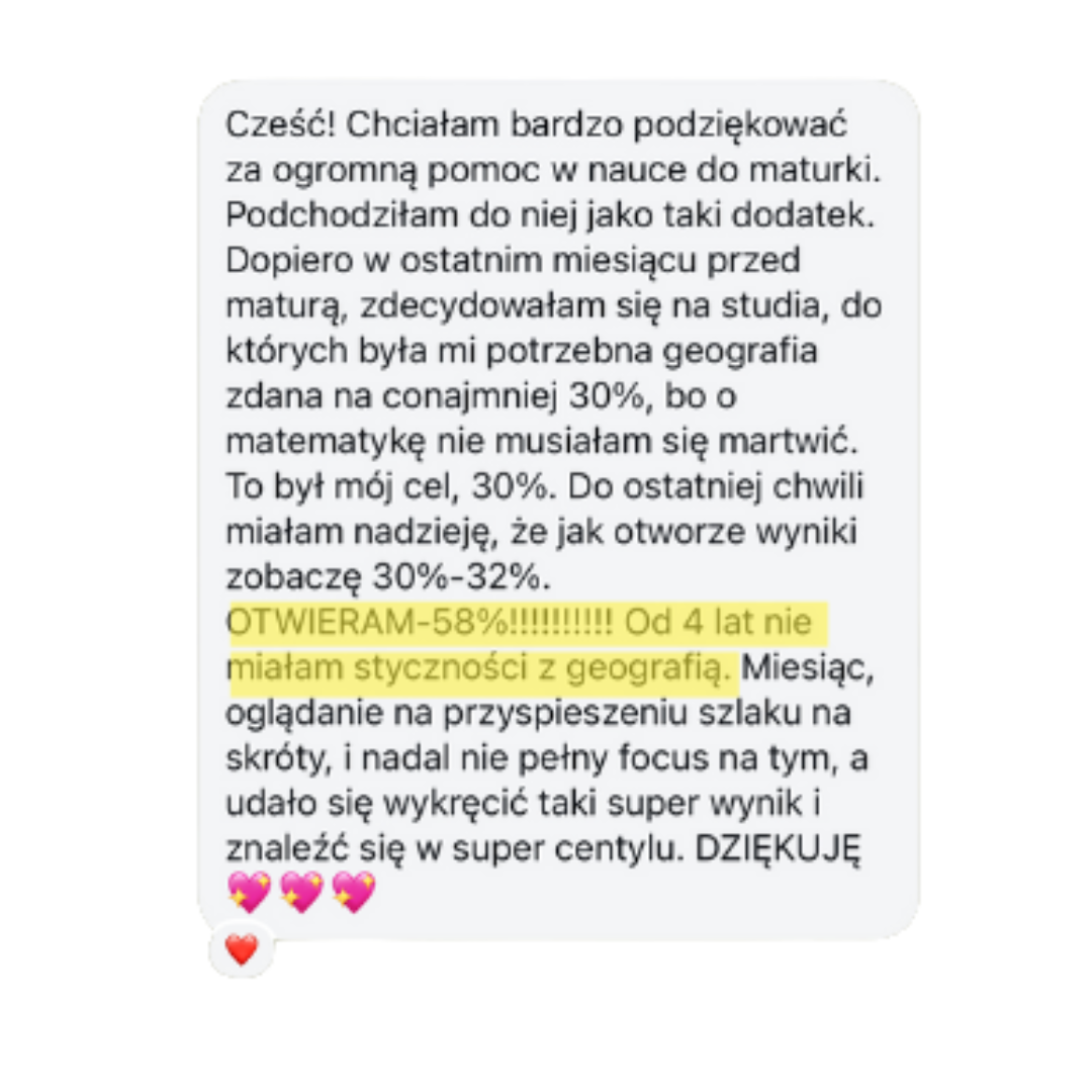 Wiem, jak Ci pomóc – od 4 lat przygotowuję maturzystów do egzaminu z geografii, a moi kursanci osiągają wyniki 70%, 80%, a nawet 90%+.